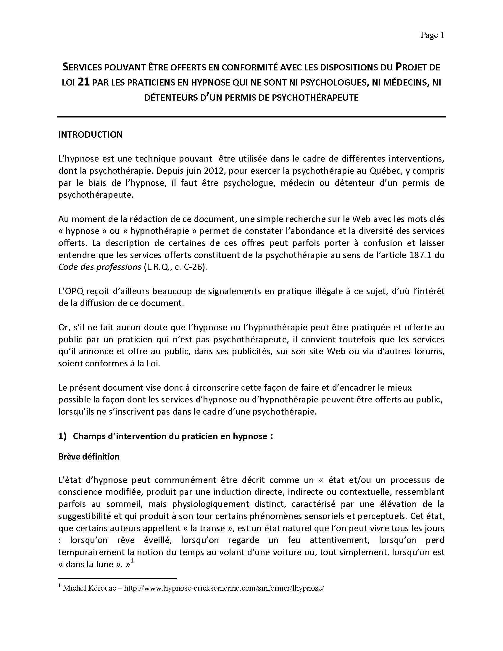 Services pouvant être offerts par les praticiens en hypnose qui ne sont ni psychologues, ni médecins, ni détenteurs d'un permis de psychothérapeute, en conformité avec les dispositions du projet de loi 21