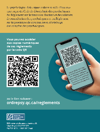 Afin de composer avec la nouvelle réalité numérique, l’Ordre a fait développer des affiches, que vous pouvez télécharger, imprimer et exposer dans votre salle d’attente, qui invitent les clients à consulter les règlements en ligne. L’affiche comporte un code QR de même qu’une adresse Web où les trois copies numériques des règlements sont disponibles.