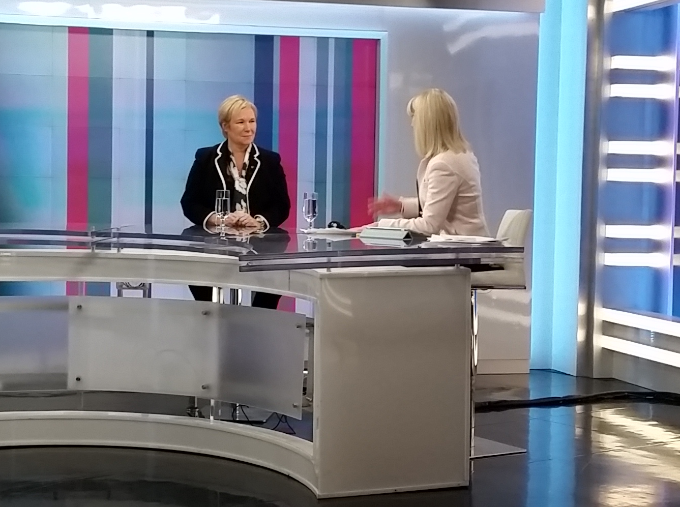 Tout au long de sa présidence, la Dre Christine Grou, psychologue, a accordé de nombreuses entrevues dans les médias. Sur cette photo, en octobre 2016, la présidente de l’Ordre est en entrevue avec la journaliste et animatrice Isabelle Richer sur les ondes d’ICI RDI.