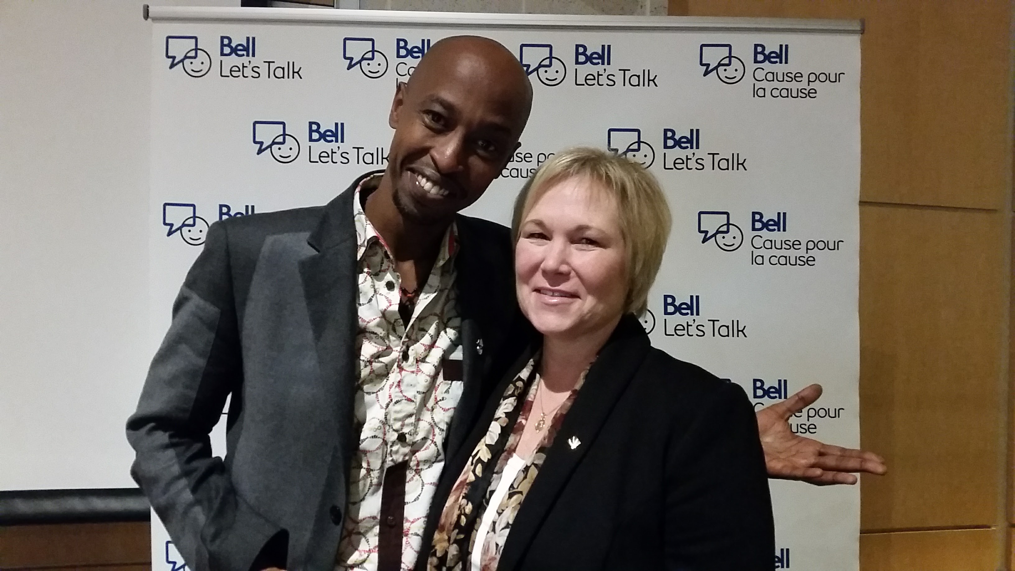 Sur cette photo, prise le 25 janvier 2017 dans le cadre de la Journée Bell Cause pour la cause, la présidente de l’Ordre est en compagnie de l’acteur et humoriste Michel Mpambara, l’un des porte-parole de l’initiative Bell Cause pour la cause, dont l’Ordre des psychologues était partenaire.