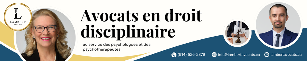 Contactez l'annonceurSi vous êtes confronté à une enquête du syndic, une plainte disciplinaire ou une inspection professionnelle, il est essentiel d’être accompagné par des avocats possédant une réelle expertise en droit disciplinaire. Chez Lambert Avocats, nous comprenons que le droit disciplinaire ne touche pas seulement votre pratique, mais aussi votre réputation, votre permis et votre avenir professionnel. Notre équipe met à votre service plus de 45 ans d’expérience consacrées à la défense des professionnels. Nous offrons une représentation rigoureuse, stratégique et humaine, adaptée aux réalités propres à la pratique en psychologie et en psychothérapie. Notre approche vise à maximiser les chances de fermeture de l’enquête, obtenir les meilleurs résultats possibles en cas de plainte, vous guider pour protéger votre droit de pratique et votre réputation. Dans ces moments éprouvants, ne restez pas seul. Une intervention rapide peut faire toute la différence. Contactez-nous en toute confidentialité!