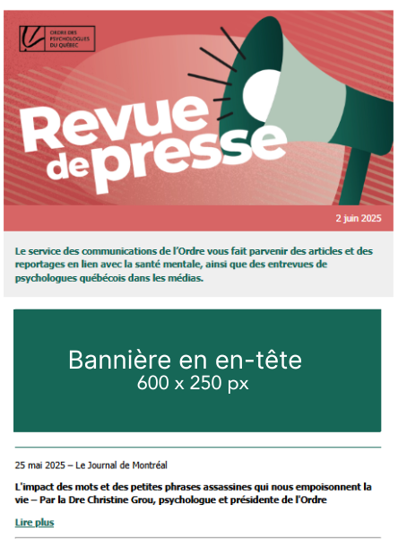 Veuillez noter que l'affichage d'une publicité dans le courriel de la Revue de presse via l’Ordre des psychologues du Québec est soumise à la Politique des annonceurs.
